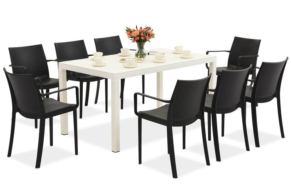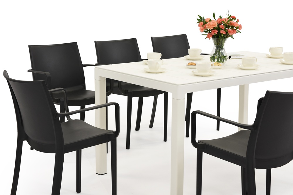 - La mesa y las sillas se han fabricado en plástico (technorattan).